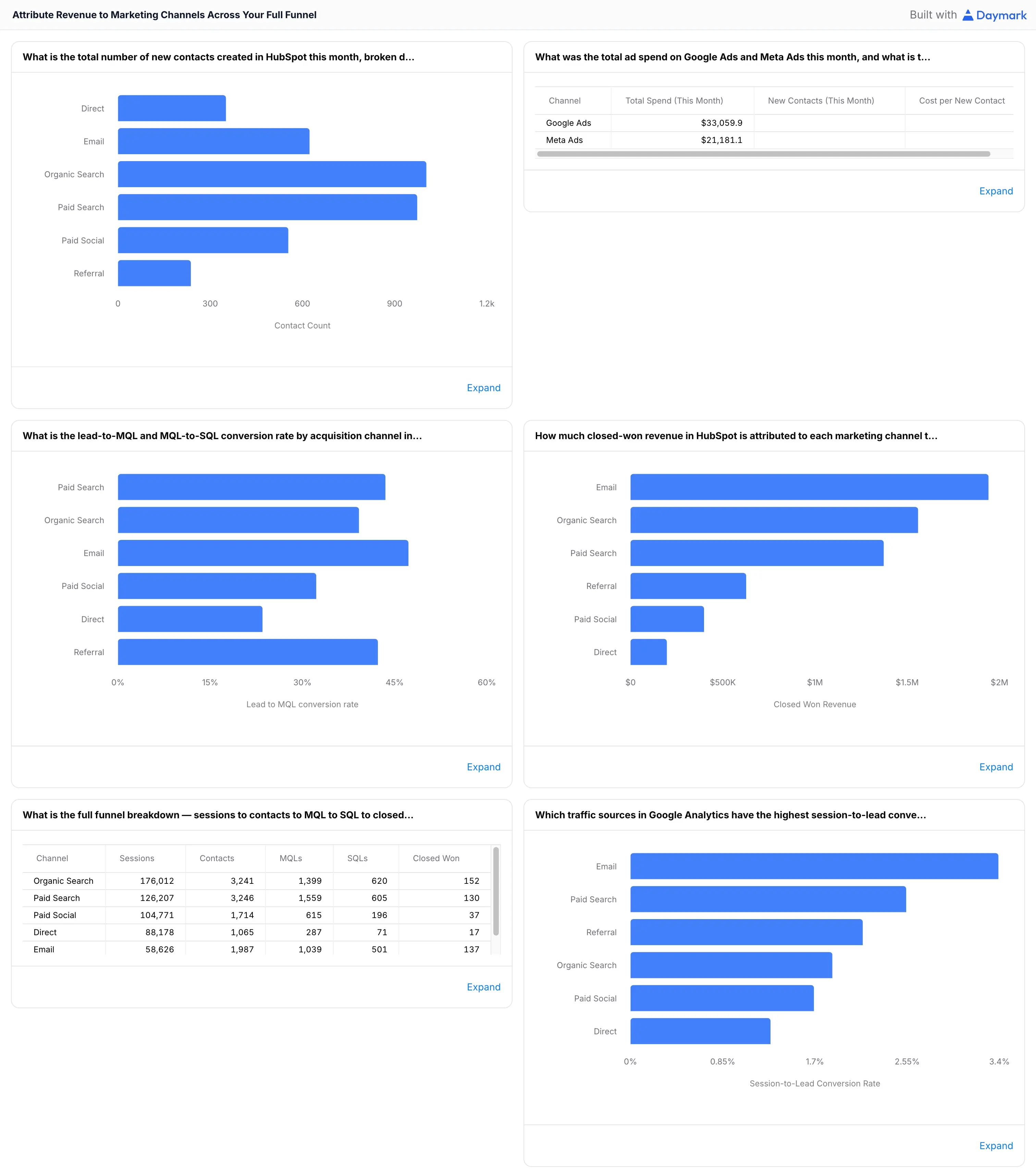 By joining Google Ads and Meta Ads spend data with Google Analytics traffic and HubSpot pipeline and closed revenue, this dashboard gives you true cost-per-acquisition and channel-level ROI — the metrics that static single-source dashboards and Looker Studio templates simply cannot produce.